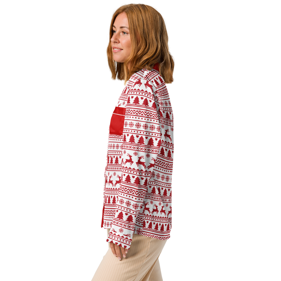This women’s pajama top is made from a silky polyester fabric that drapes softly against the skin. It has a relaxed fit and features elegant piping around the collar, cuffs, and chest pocket. The top offers a chic yet cozy look, making it an easy choice for relaxing at home or pairing with other loungewear for a quick errand.